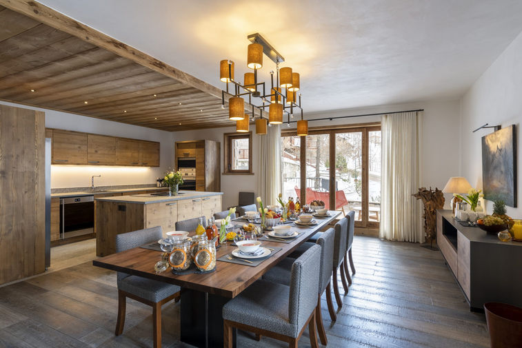 The open plan living and dining area is spacious and welcoming. Decorated with a largely neutral palette, rich woods and textured fabrics, the effect is a refined and elegant social space, enriched by carefully selected art works that colour the room. Up to ten guests can be seated at the large dining table which is overlooked by a stylish, contemporary kitchen complete with all the essentials and with ample storage space to maintain a clutter-free space. Glamorous and practical in equal measure, this is the place for long, slow meals shared with friends and family. The focal point of the adjoining living area is a circular central fireplace, creating a warm and cosy ambience. A large L-shaped sofa and a couple of arm chairs provide seating space for up to eight guests. The living area has been finished in neutral greys and natural tones with accents of blues to deliver a cool and modern space. Floor to ceiling windows frame incredible views of the world-famous La Face piste. There is a WC in the entrance hallway for visitors.