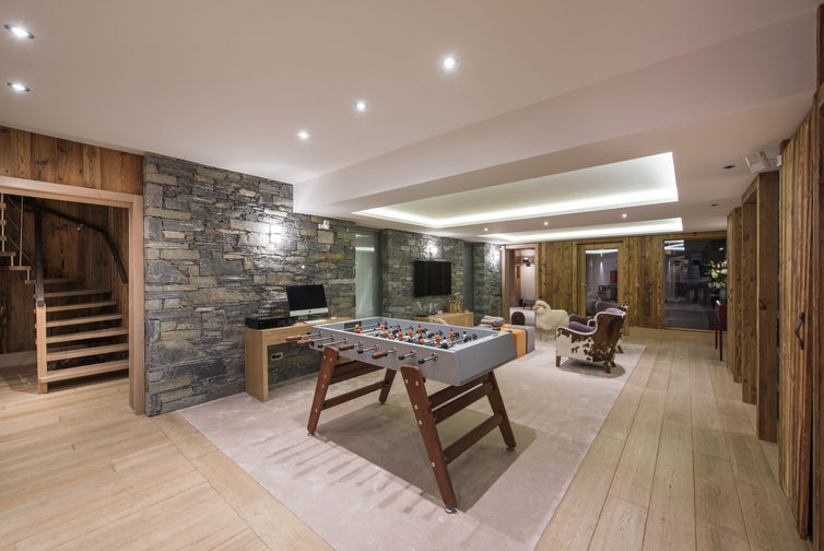 Taking the stairs down to the next floor you will find five of the six bedrooms. All of the bedrooms have en-suite bathrooms with separate showers, fireplaces, and TVs. The bedrooms have been carefully designed for maximum comfort, ensuring that you start each day feeling refreshed and ready for the slopes. You will also find the games/TV room on this floor, an ideal space for entertaining all ages with Sky, Apple TV, Play Station, a darts board, a bar, and a pool table. Adjacent to this room is a play room, ideal for younger family members, with table football, TV, Wii, toys and games.