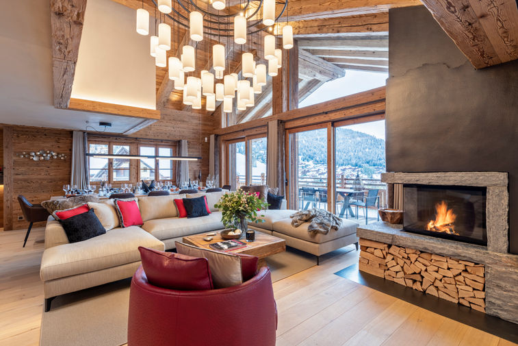 Taking the stairs up to the first floor you reach the impressive open plan living and dining area and the kitchen. The views from this stunning living area are so perfectly aligned across the valley to Mount Rogneaux that you could imagine the designers placed the peak there themselves! There is a large central fireplace welcoming you into the room, with ample seating for the whole party. This is the perfect space to snuggle down with a drink and while away the evening. The elegant dining table seats ten and the kitchen is equipped with every modern appliance, amateur chefs won’t be disappointed and if you have booked the chalet catered you will be able to watch our chef create your meals in style.