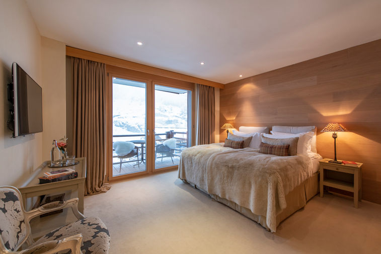 Twin or Superking size bed. En-suite bathroom with shower. Opens to private balcony, view across Zermatt to Matterhorn. Plasma TV with Sky & DVD Player.