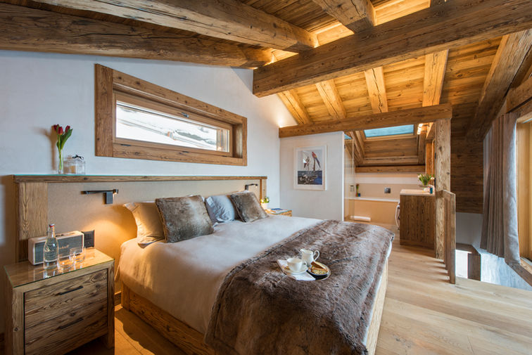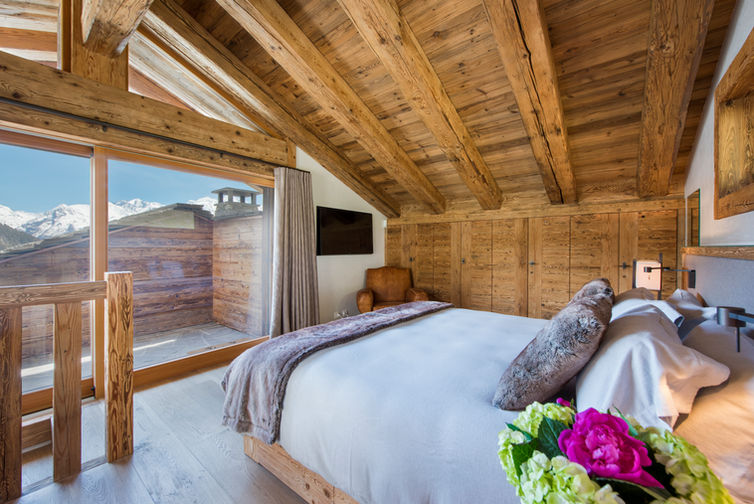 The top floor of the chalet is dedicated to the master bedroom which has its own private balcony and en-suite bathroom, a separate shower, and his and hers sinks.