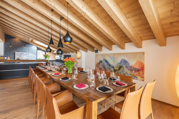 Five star Chalet Tuftra Findelbach sleeps up to 16 (+5) in 5 double/twin en suite bedrooms, one quad room, and one triple rooms (there is an additional lounge that can be made as a double bed) with a lovely wellness consisting of a steam room, sauna, Onsen and outdoor hot-tub. The dining area is located on the upper floor and the solid oak dining table can accommodate 20 comfortably. There is also comfortable lounge and open 360 degree Swiss fire cube where you can relax after an unforgettable day on the slopes with a glass of wine or a hot chocolate. The lounge has stunning views of the Matterhorn. The chalet has and wireless internet throughout. There is a fully fitted kitchen where our hand-picked team will work to create fabulous cuisine throughout your stay. Located off the lounge is a lovely office area where you can catch up with work if required and also a cinema room with TV, DVD, Playstation. There is also a kids bunk-room located on the upper floor so the younger members of your party can retire for the evening but still not be too far away. The ground floor of Chalet Tuftra Findelbach comprises of two large en suite double bedrooms, one with Matterhorn views and the other with views down over the burbling brook. There is also a lounge which can be made up as a double bedroom if you have a larger party or can be utilised as a separate lounge area. There are two other double bedrooms that share a bathroom with double showers, one with free-standing bath with Matterhorn views and a the other with views down over the burbling brook. There is also a guest bathroom with shower and WC on this floor. The lower ground floor of Chalet Tuftra Findelbach has a double en suite studio with a view to the stream and a double/twin bedroom which as a third bed over it which can be utilised for a couple or up to three guests. There is an ensuite shower room with WC. There is also a fully fitted gym and a wellness area with steam room, sauna, Onsen and outdoor hot-tub all of which have Matterhorn views.There is a lift in the chalet making it suitable for less able bodied guests. Our chefs and chalet staff are on hand to provide you with a chilled glass of champagne in the Jcuzzi, organise your massage and prepare breakfast, afternoon tea and a six course gourmet evening meal. There is a ski and boot-room with heated boot racks at the chalet. The village centre is 4 minutes in an electro car or a 15 minute walk.